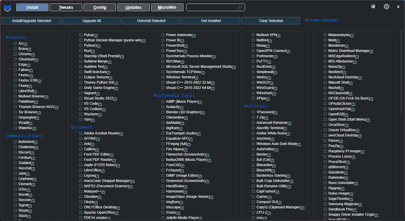 Once this appears, select the applications above Firefox, Thorium, Notepad++, VLC, 7-Zip, Paint.net, ShareX, ImageGlass, WizTree and hit Install/Upgrade Selected in the top-left